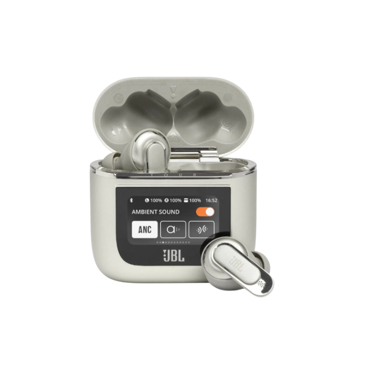 ✅ Overview ✔Smart Touchscreen Charging Case (visible in image)– First of its kind, allows you to control playback, ANC, calls, and more directly from the case without using your phone. ✔Adaptive Noise Cancelling (ANC on display)– Actively blocks out unwanted background noise for an immersive listening experience. ✔Ambient Sound & TalkThru Modes– Lets in external sounds or voices, ideal for conversations or awareness in public spaces. ✔Long Battery Life– Case UI shows full 100% battery indicators, typical model offers up to40+ hours total playback(10h earbuds + 30h case). ✔Premium Design– Metallic silver finish with ergonomic in-ear stems and JBL branding for a sleek, high-end look.
